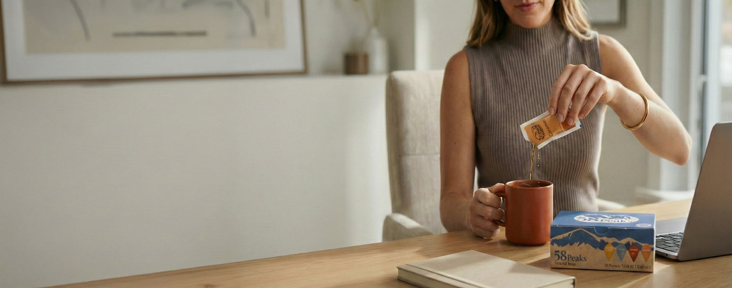 We built 58 Peaks because syrup bottles don't belong in backpacks, desk drawers, or car cup holders. Our single-serve packets deliver consistent café flavor anywhere life takes you, with zero mess, zero guesswork, and zero compromises.